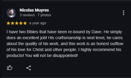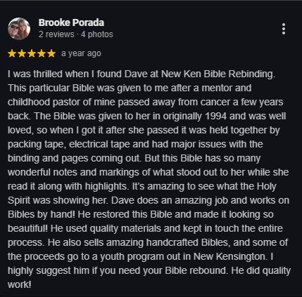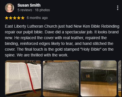 Fill out the contact form below or text 724-472-6201 if you would like a bible you have rebound.